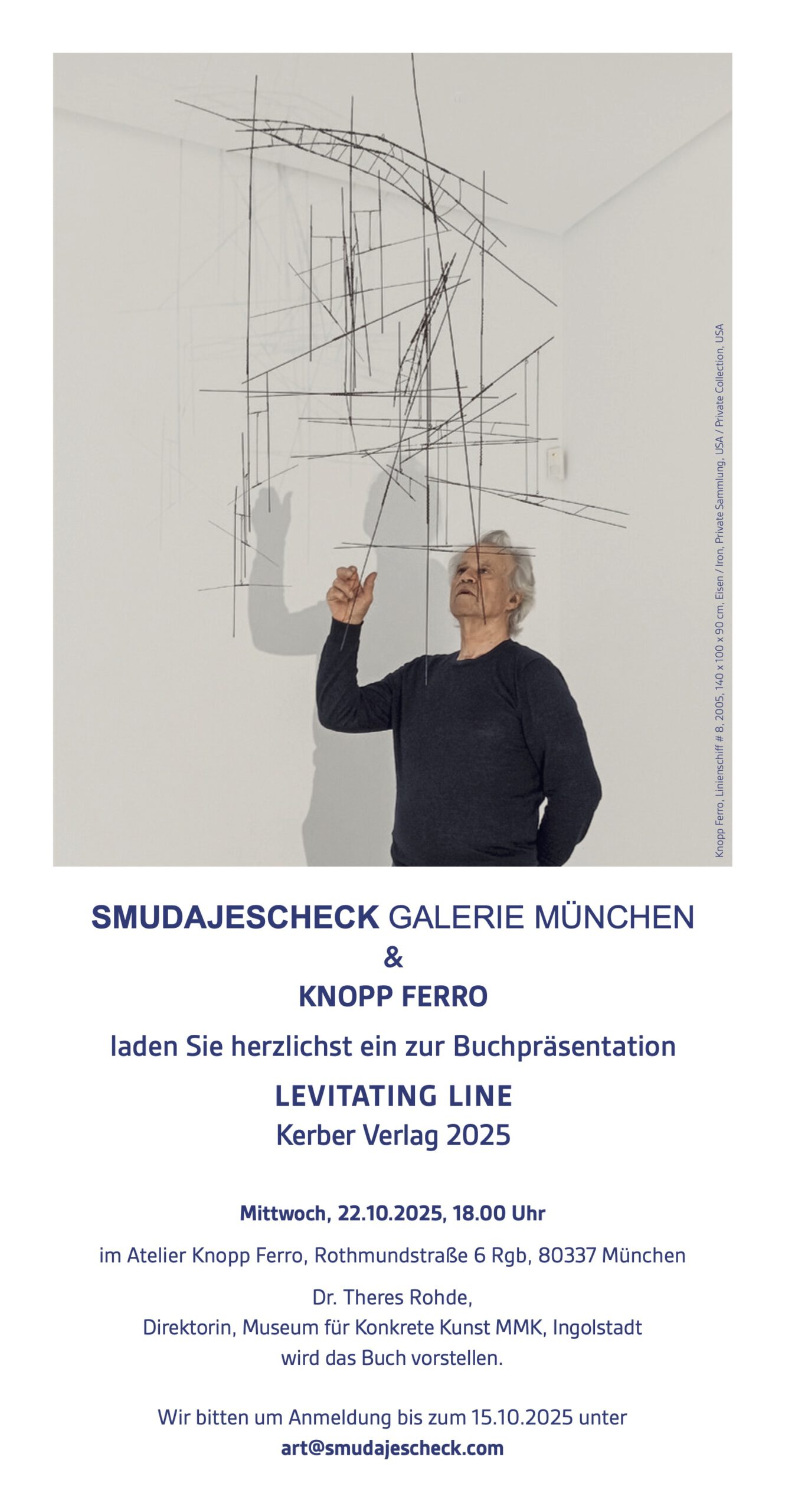 Knopp Ferro (1953*) arbeitet in München und lebt in der Region Ammersee. Zu Beginn seiner Karriere war Ferro mit seiner Performancegruppe und Punkband Jet Ferro Protagonist der avantgardistischen Fluxus-Bewegung. Er war mit Zirkus Roncalli und mit der Zürcher Theaterkompagnie Bumper to Bumper unterwegs. Bekannt wurde der Künstler in den vergangenen 20 Jahren durch seine grazilen dreidimensionalen „Raumzeichnungen“. Ferro konstruiert seine erfrischend leichten, grafischen Objekte aus Metall, die sowohl in Innenräumen als auch in Freiräumen ihre Wirkung entfalten. Viele seiner Arbeiten bewegen und verändern sich im Lufthauch oder Wind. Farbe oder sogar Blattgold verfeinern das rohe Metall. Die Interaktion von Farbe und Linie spielen in mehreren Werkreihen eine große Rolle. “Meine Skulpturen sind dreidimensionale Zeichnungen im Raum“, sagt Ferro. Er beherrscht kleine Formate bis hin zu riesigen Installationen, stehend oder hängend. Seine Arbeiten werden international auf Messen, in Museen und in Galerien gezeigt. Ferro ist in renommierten privaten und öffentlichen Sammlungen vertreten.