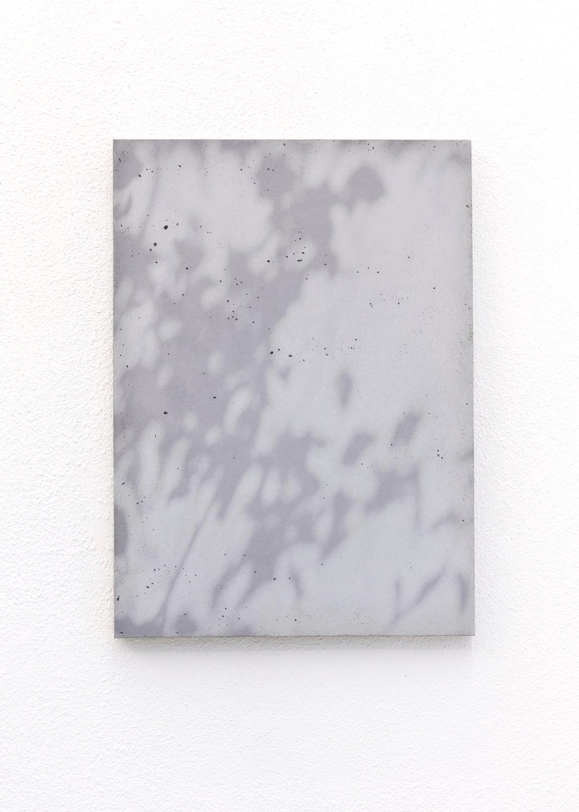 Auf den ersten Blick lassen sich Sichtbeton und Siebdruck kaum mehr voneinander unterscheiden. Handelt es sich bei dem dunklen Fleck um eine offene Pore des Betons oder dichte Punkte des Druckrasters? Diese Bildwirkung erinnert an aus der Gestaltpsychologie stammende Kippfiguren wie die Rubin-Vase, in der Betrachtende eine Vase oder zwei Gesichter erkennen können – die organisierte Ganzheit von Figur und Grund gerät aus dem Gleichgewicht. Das Spiel mit der Wahrnehmung verdeutlicht die Gegensätze, welche Xenia Fumbarev in ihren Betonbildobjekten zusammenführt. Das Sonnenlicht warf Blätter, Zweige und Häuserecken auf Fassaden. Fixiert ist, was dynamisch über triste Wände tanzte. Vereinigt werden flüchtige Momente mit dauerhaftem Material. Bildbearbeitung und Druckprozess haben das „Es-ist-so-gewesen“ der Fotografie auf ein Minimum reduziert und dabei ein illusionistisches Rätsel erzeugt.